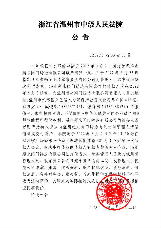 ZHEJIANG XINRONG ENTERPRISE LIQUIDATION FIRM CO.,LTD浙江省人民法院破產案件管理人安徽省人民法院破產案件管理人