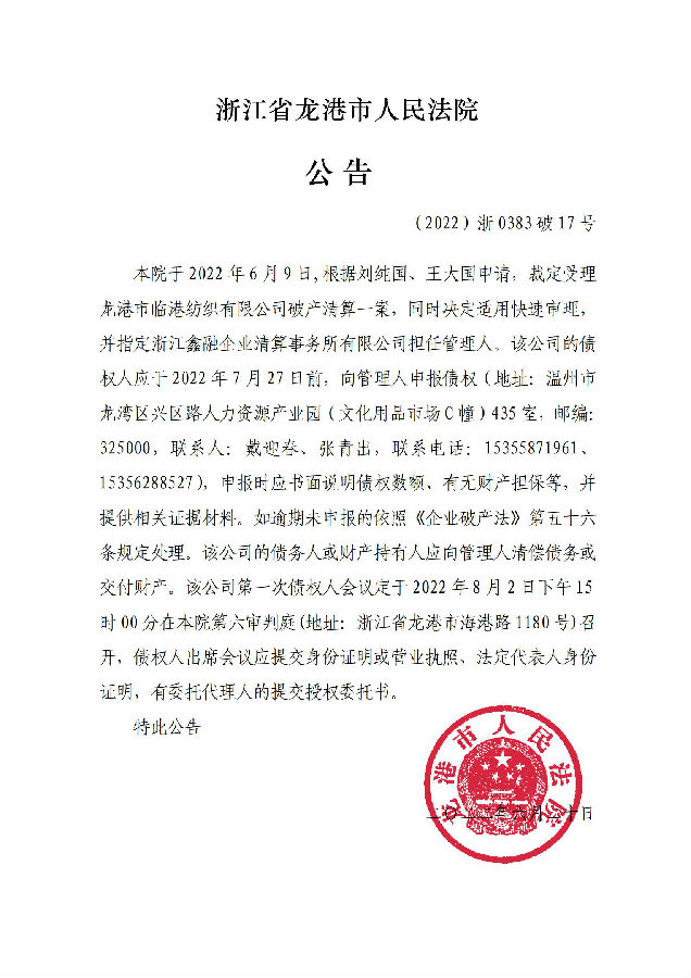 ZHEJIANG XINRONG ENTERPRISE LIQUIDATION FIRM CO.,LTD浙江省人民法院破產(chǎn)案件管理人安徽省人民法院破產(chǎn)案件管理人