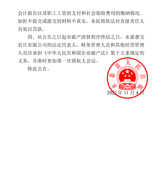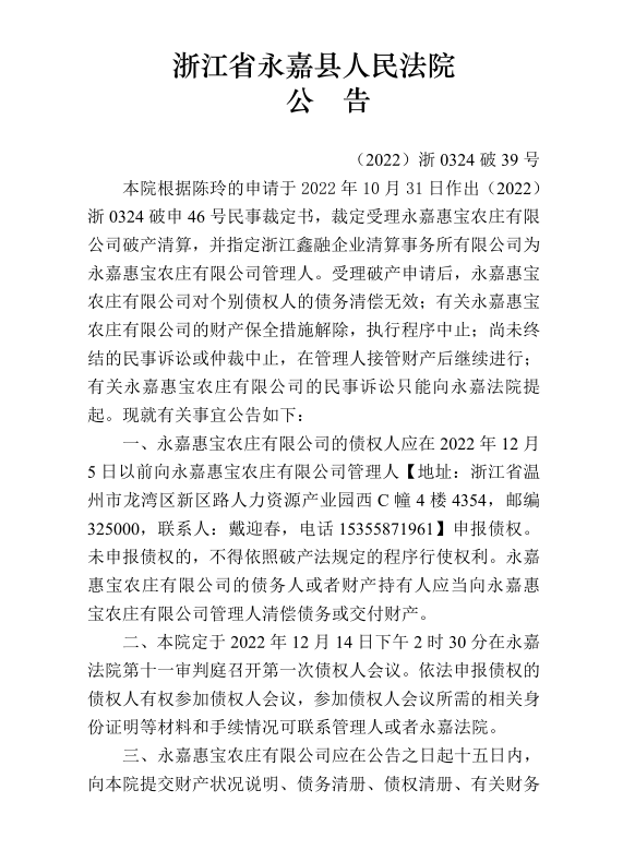 永嘉惠寶農(nóng)莊有限公司破產(chǎn)清算案公告