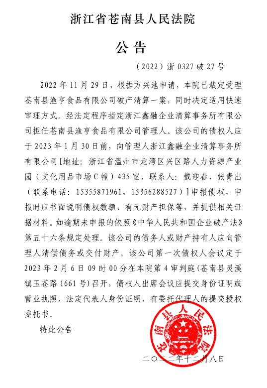 蒼南縣漁亨食品有限公司破產(chǎn)清算案公告