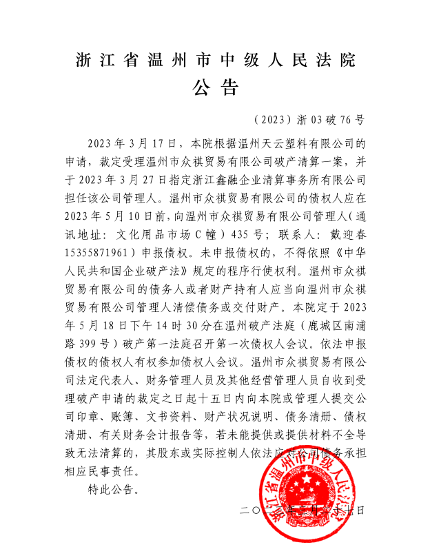 ZHEJIANG XINRONG ENTERPRISE LIQUIDATION FIRM CO.,LTD浙江省人民法院破產(chǎn)案件管理人安徽省人民法院破產(chǎn)案件管理人