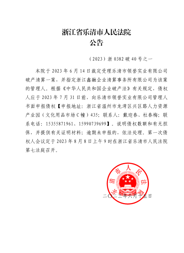 ZHEJIANG XINRONG ENTERPRISE LIQUIDATION FIRM CO.,LTD浙江省人民法院破產(chǎn)案件管理人安徽省人民法院破產(chǎn)案件管理人