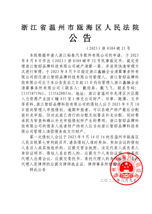 ZHEJIANG XINRONG ENTERPRISE LIQUIDATION FIRM CO.,LTD浙江省人民法院破產(chǎn)案件管理人安徽省人民法院破產(chǎn)案件管理人