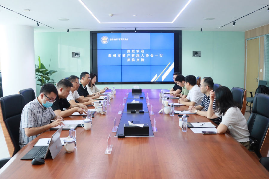 2023年8月23日,溫州市破產(chǎn)管理人協(xié)會(huì)會(huì)長(zhǎng)嚴(yán)凌振、副會(huì)長(zhǎng)王浩宇、秘書長(zhǎng)潘成波、對(duì)外交流委員會(huì)主任韓笑、文宣委主任陳炯燃、業(yè)務(wù)指導(dǎo)委員會(huì)副主任鄭建初一行來我會(huì)考察交流。寧波市破產(chǎn)管理人協(xié)會(huì)會(huì)長(zhǎng)董俊、副會(huì)長(zhǎng)王敏驥、鄭勇、秘書長(zhǎng)趙俊參加座談交流。