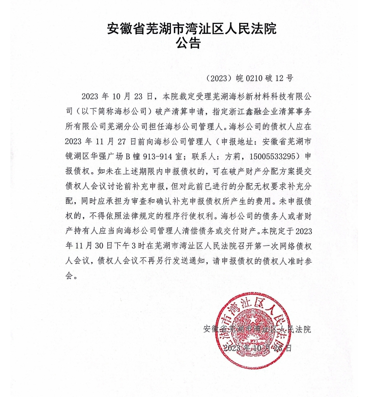 ZHEJIANG XINRONG ENTERPRISE LIQUIDATION FIRM CO.,LTD浙江省人民法院破產(chǎn)案件管理人安徽省人民法院破產(chǎn)案件管理人