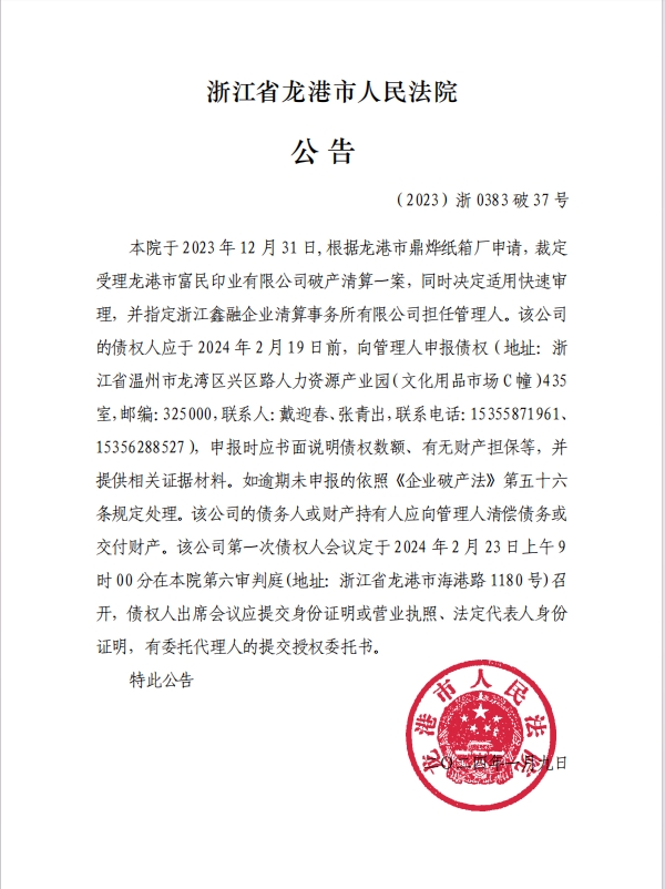 龍港市富民印業(yè)有限公司破產(chǎn)清算公告