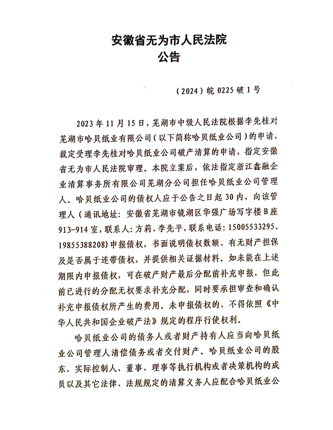 蕪湖哈貝紙業(yè)有限公司破產(chǎn)清算公告