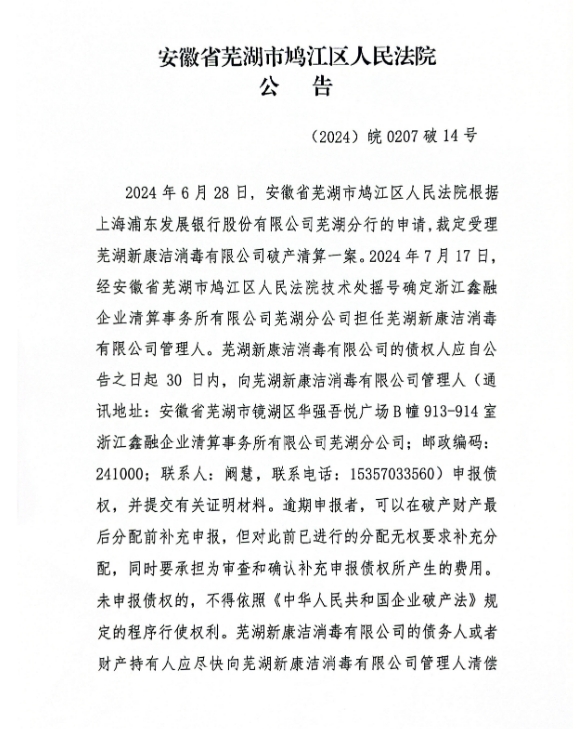 蕪湖新康潔消毒有限公司破產(chǎn)清算案公告