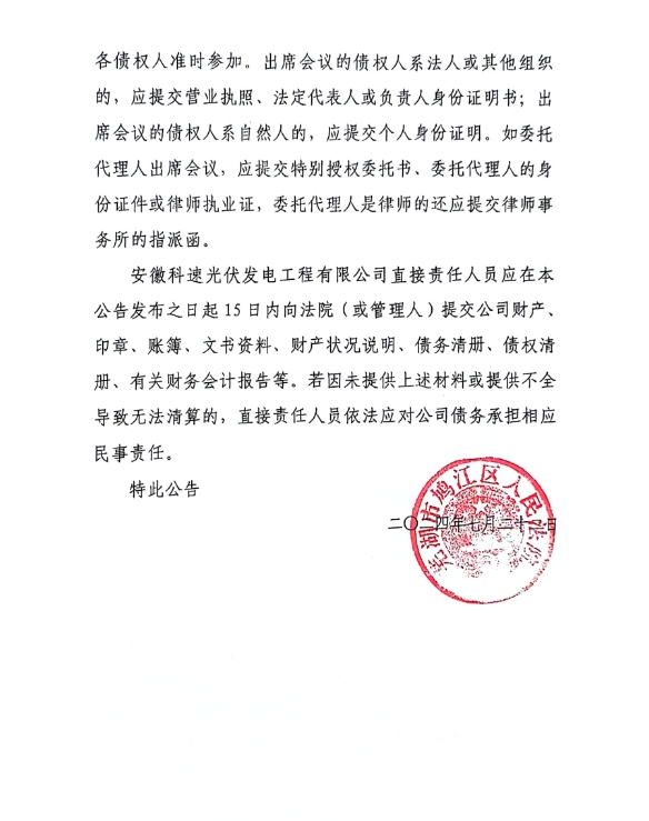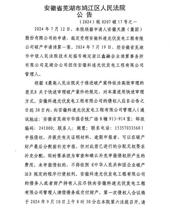 蕪湖科速光伏發(fā)電工程有限公司破產(chǎn)清算案公告