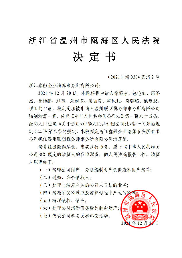 溫州聯(lián)明稅務(wù)師事務(wù)所有限公司強制清算案決定書