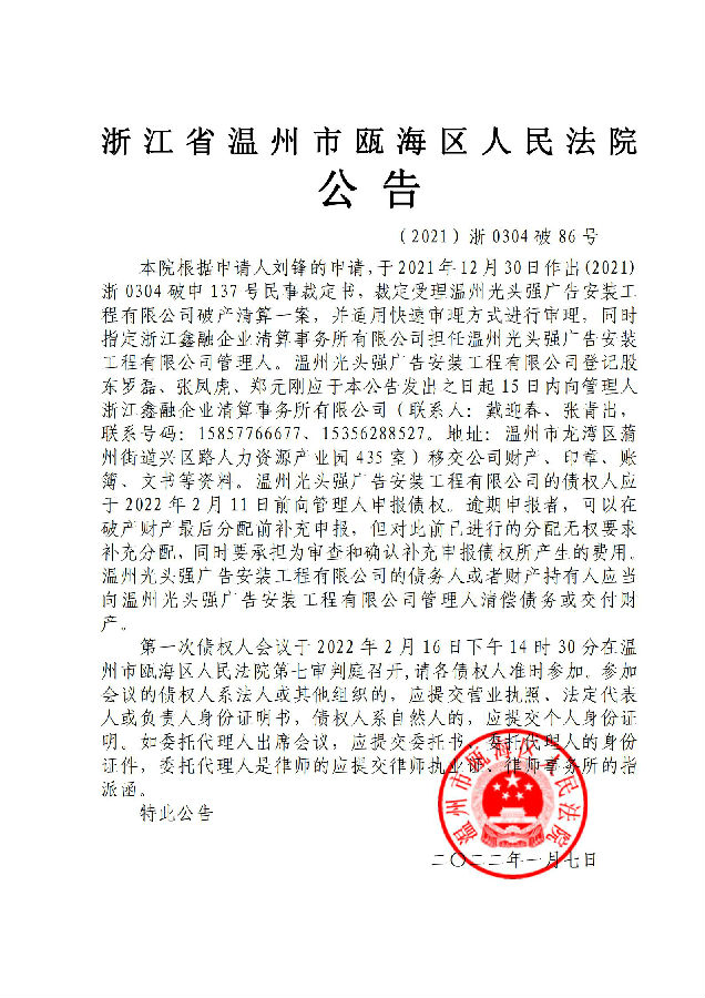 ZHEJIANG XINRONG ENTERPRISE LIQUIDATION FIRM CO.,LTD浙江省人民法院破產案件管理人安徽省人民法院破產案件管理人