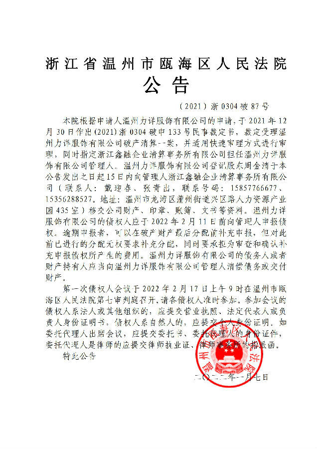 ZHEJIANG XINRONG ENTERPRISE LIQUIDATION FIRM CO.,LTD浙江省人民法院破產(chǎn)案件管理人安徽省人民法院破產(chǎn)案件管理人